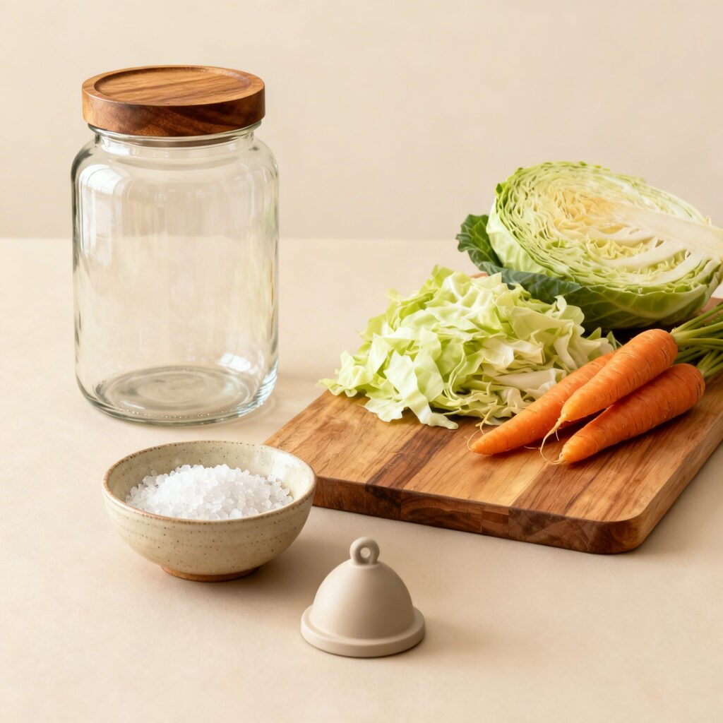Escolha um fermento de entrada: repolho (chucrute simples), pepino lactofermentado ou gengibre fermentado. São caminhos previsíveis e fáceis de ajustar.